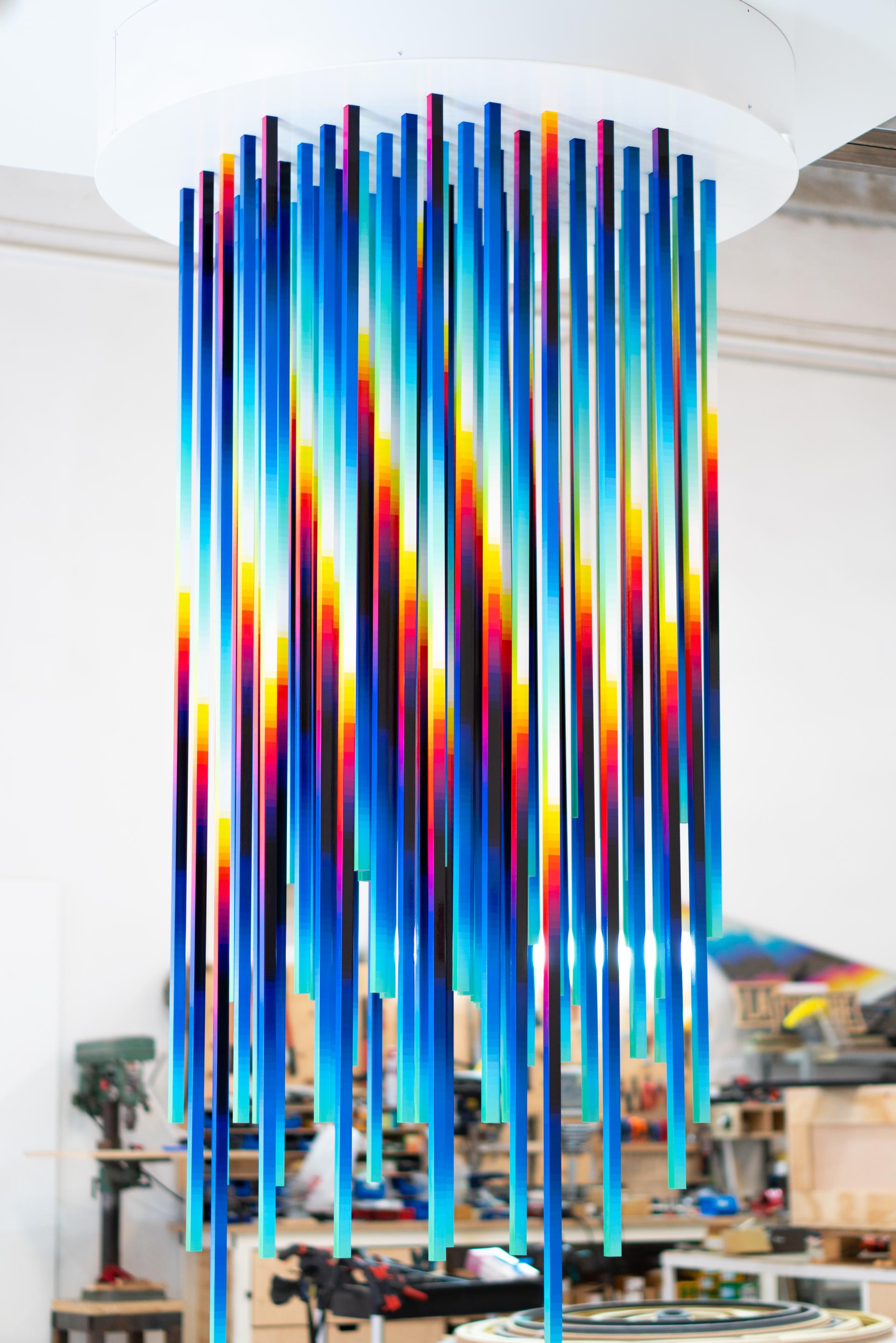 He adds structured and geometric rigour to the creations, while Felipe Pantone brings his unique visual fingerprint made of vivid colour patterns and moving palettes.