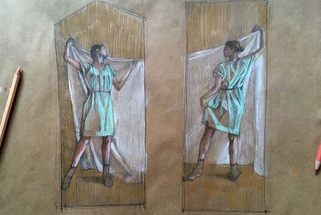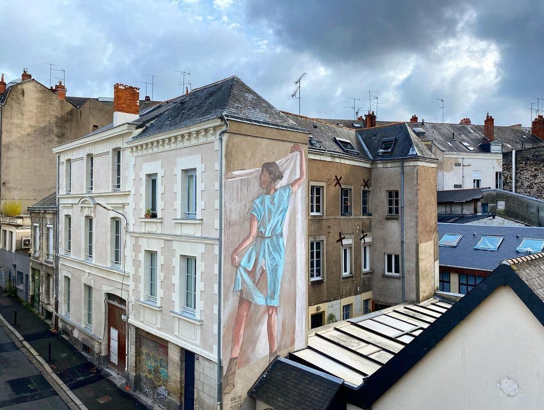 "The concept of the wall which I like most is a kind of celebration of life, there for the reading can work out with the actual moment we are living, with my personal situation which make it very special for me and to start, because I read an article, which stayed strongly on my mind, which title was "Angers and the sweetness of living", it was a recently written article talking about the simple nice things of this city. The idea are two figures dancing while sharing a beautiful blanket, one figure in each wall, you will see it clear in sketch, but I am happy with that idea since months now."